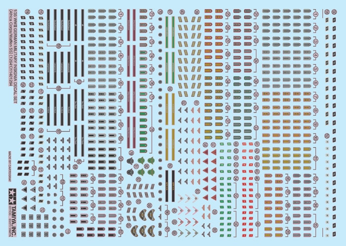 Ensemble de décalcomanies d'insignes allemands des uniformes des soldats du Corps africain allemand, de la police militaire et de la waffen ss. Comprend des insignes de grade, des médailles et des brassards.
