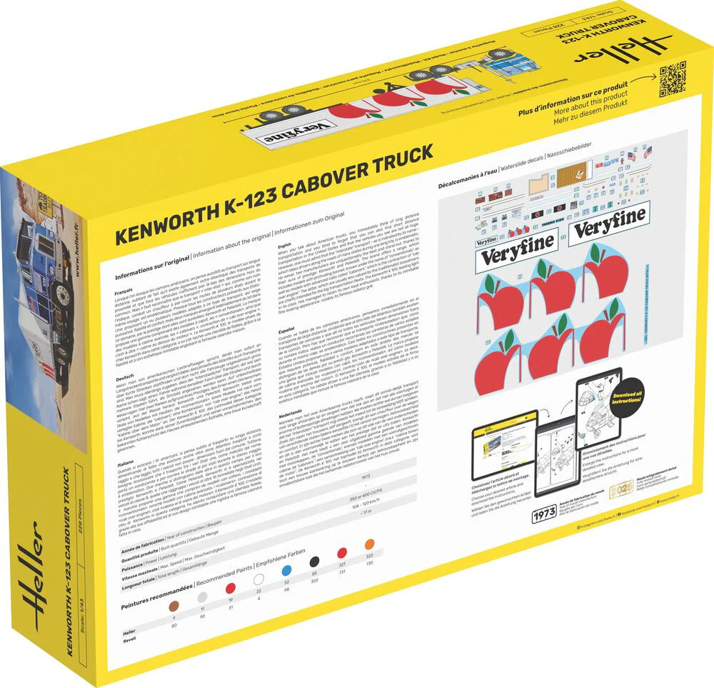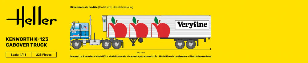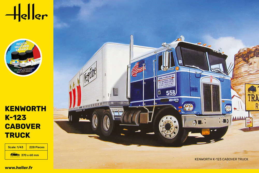 Ce starter kit reproduit le Kenworth K-123, Cabover truck, un camion américain de transport sur longue distance. Ce modèle comporte une cabine avancé, "cabover", contraction de "cab over engine", "cabine au dessus du moteur", et il est le modèle phare de chez Kenworth. Le starter kit contient la colle, le pinceau et les peintures principales.