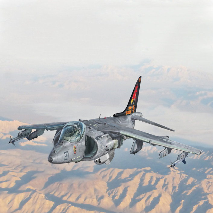 Cette maquette à l'échelle 1/72 reproduit le AV-8B Harrier II, un avion d'attaque et d'appui aérien rapproché multirôle. Il est le fruit d'une collaboration entre les industries aéronautiques britannique et américaine. Il représente une évolution significative par rapport au 1er appareil à décollage court et atterrissage vertical (ADAV). L'AV-8B a été développé pour opérer depuis des porte-avions sans catapulte, des navires d'assaut amphibie et des pistes d'atterrissage improvisées. Capable d'emporter une charge offensive composée de missiles air-air, de bombes guidées et de missiles air-sol, l'AV-8B se caractérise par une grande flexibilité opérationnelle et la capacité d'effectuer de nombreux types de missions.