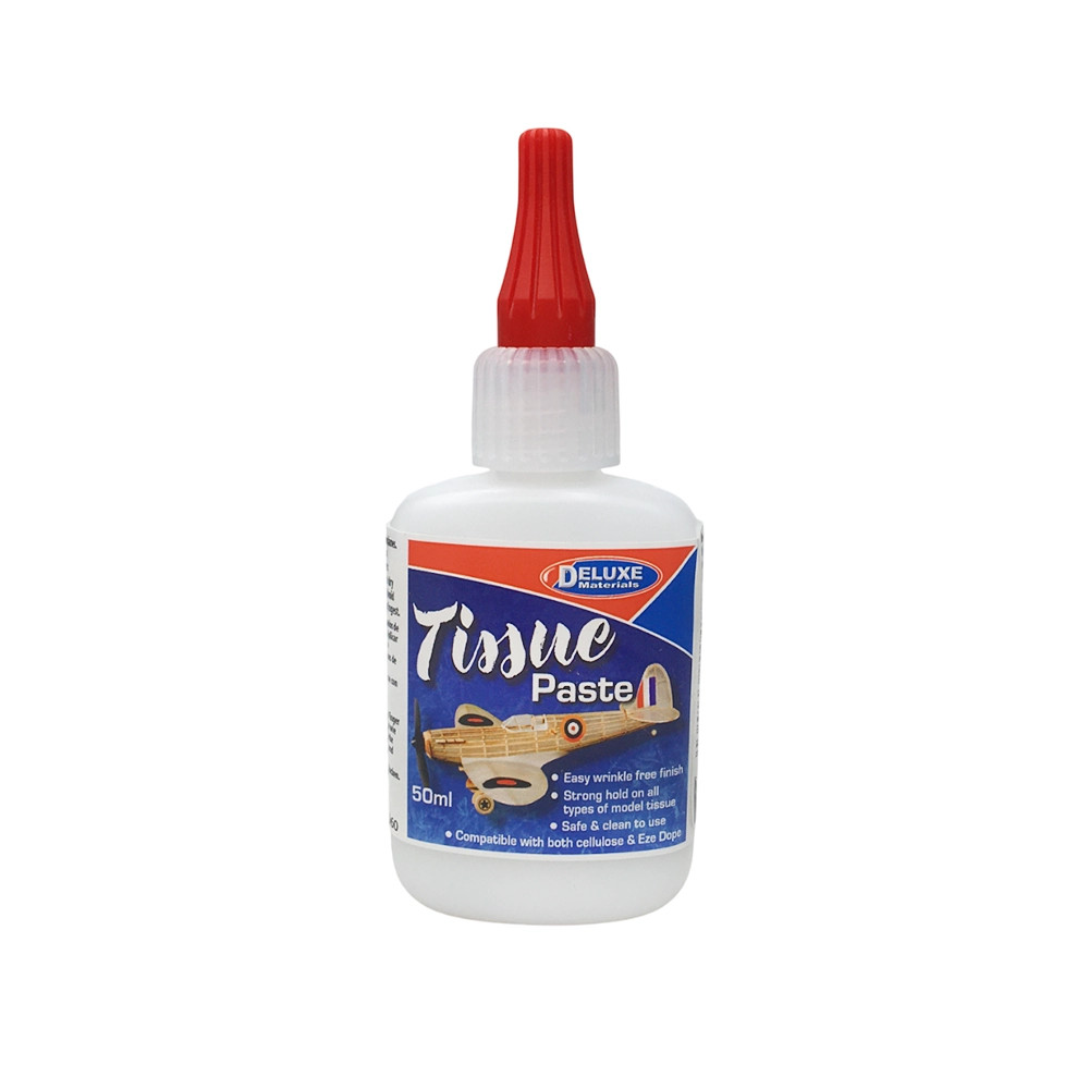 Pâte transparente à séchage rapide, spécialement conçue pour la fixation du papier de soie sur les maquettes d’avions.