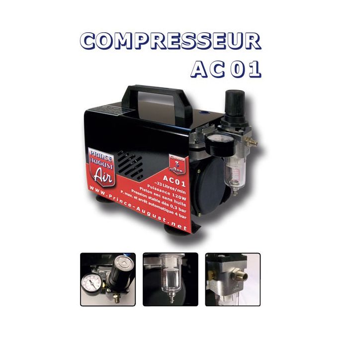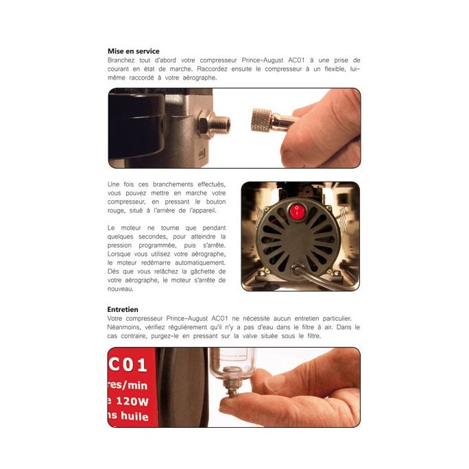 - Compresseur AC01 : compresseur à piston sec sans huile, avec manomètre pour pression d’air chiffrée, filtre à air, purgeur, et système marche/arrêt automatique. Silencieux et efficace.