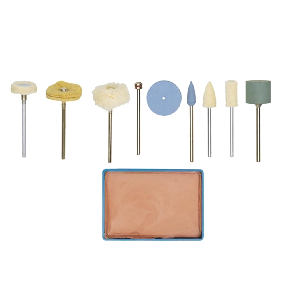 Contenant 3 polissoirs en feutre (cylindre, sphère et roue, 3 polissoirs en silicone (projectile, cylindre et disque), 1 disque à polir en coton, 1 polissoir en daim et pâte à polir.