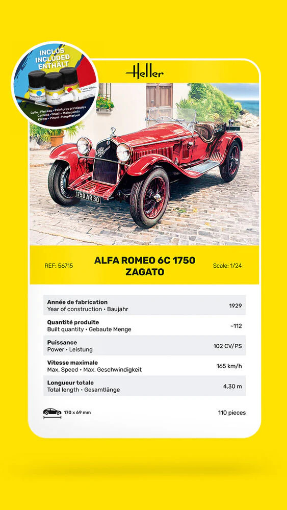Ce starter kit reproduit la Alfa Romeo 6C 1750 Zagato, produite en série entre 1929 et 1933 et en plusieurs versions. Elle connue un énorme succès grâce à sa tenue de route, son freinage efficace, son moteur surpuissant et fiable, ainsi que sa carrosserie élégante et profilée, le tout due au talent de ZAGATO. Le starter kit contient la colle, le pinceau et les peintures principales.