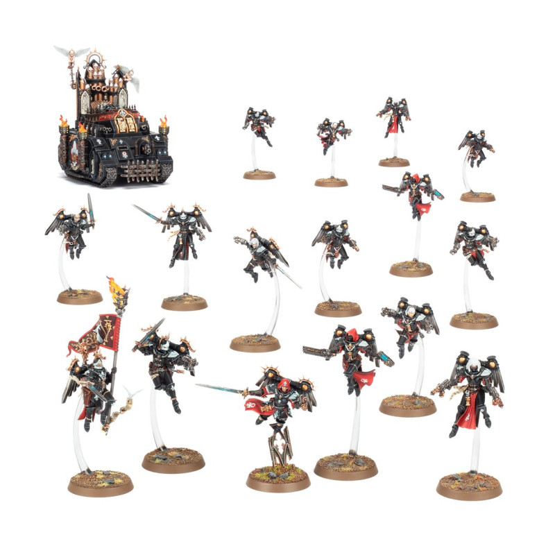 Cette Battleforce de l'Adepta Sororitas permet d'assembler une armée extrêmement agressive, menée par une Chanoinesse avec Réacteur Dorsal, disponible pour la première fois dans cette boîte. Aux côtés de cette guerrière inspiratrice, les Séraphines et les Zéphyrines s'envolent à la bataille pour abattre leur vengeance sur l'hérétique et le sorcier. Toutes ces puissantes combattantes sont soutenues par un Exorcist qui fait pleuvoir un barrage d'artillerie sur l'adversaire. Peu d'ennemis peuvent survivre à l'assaut initial de cette armée. Si vous cherchez un moyen de renforcer significativement une collection existante de l'Adepta Sororitas, toutes les unités de cette boîte trouveront leur utilité, et elle vous permettra de faire des économies par rapport à un achat des kits au détail.