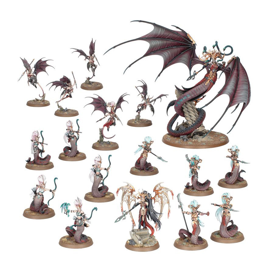 Cette boîte pleine à craquer est idéale pour entamer une nouvelle collection de Daughters of Khaine ou étoffer une armée existante à déchaîner dans les parties de Warhammer Age of Sigmar, tout en faisant des économies par rapport à un achat des kits au détail. Cette force intimidante est menée par Morathi-Khaine elle-même, aux côtés de son immense forme de Reine de l'Ombre. Des Sœurs de Sang et des Rôdeuses de Sang, des guerrières ophidiennes mutées capables d'abattre les ennemis les plus résistants, constituent le noyau de la force, complétée par des Étripeuses Khineraï ou des Égorgeuses Khineraï, des guerrières ailées qui frappent rapidement avant de s'éloigner du danger. Cette boîte est également idéale pour représenter l'Armée de Renom de Zainthar Kaï, dont vous trouverez les règles dans le Tome de Bataille de l'Ordre: Daughters of Khaine, vendu séparément.