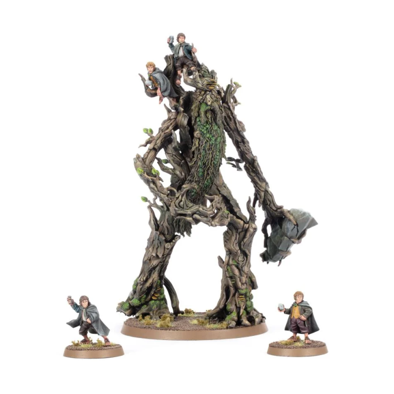 Ce kit plastique en 63 composants permet d'assembler 1x Treebeard (à monter au choix avec ou sans Merry et Pippin perchés dans ses frondaisons), 1x Meriadoc Brandybuck à pied, et 1x Peregrin Took à pied. Il est fourni avec 1x socle rond Citadel de 60mm et 2x socles ronds Citadel de 25mm.