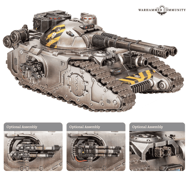 Les amateurs pourront l'équiper de destroyers laser montés sur des stabilisateurs, de bolters lourds Gravis ou de réseaux de canon laser, comme l'ancien. Les deux bolters lourds de la coque peuvent être remplacées par un lance-flammes lourd double, et les options d'attelage vont des lanceurs Havoc aux multi-fuseurs.