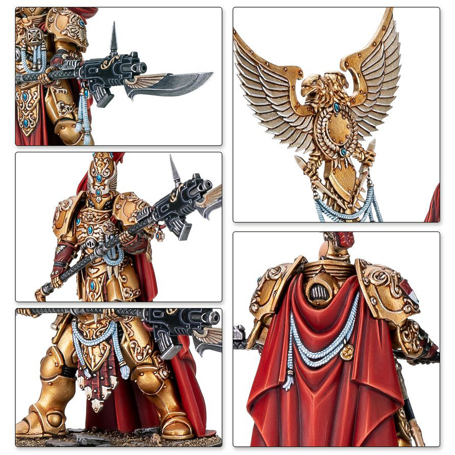Chaque Garde Custodien est couvert de détails, dont de l'iconographie sculptée et des filigranes, ce qui leur confère la majesté que l'on peut attendre des gardes du corps de l'Empereur. Un des Gardes Custodiens peut optionnellement remplacer sa lance gardienne par un vexillum du Magisterium. Le kit contient également 23 têtes interchangeables – 12 casquées et 11 nues – et 6 panaches interchangeables entre les casques, ce qui vous permet de personnaliser facilement vos guerriers légendaires.