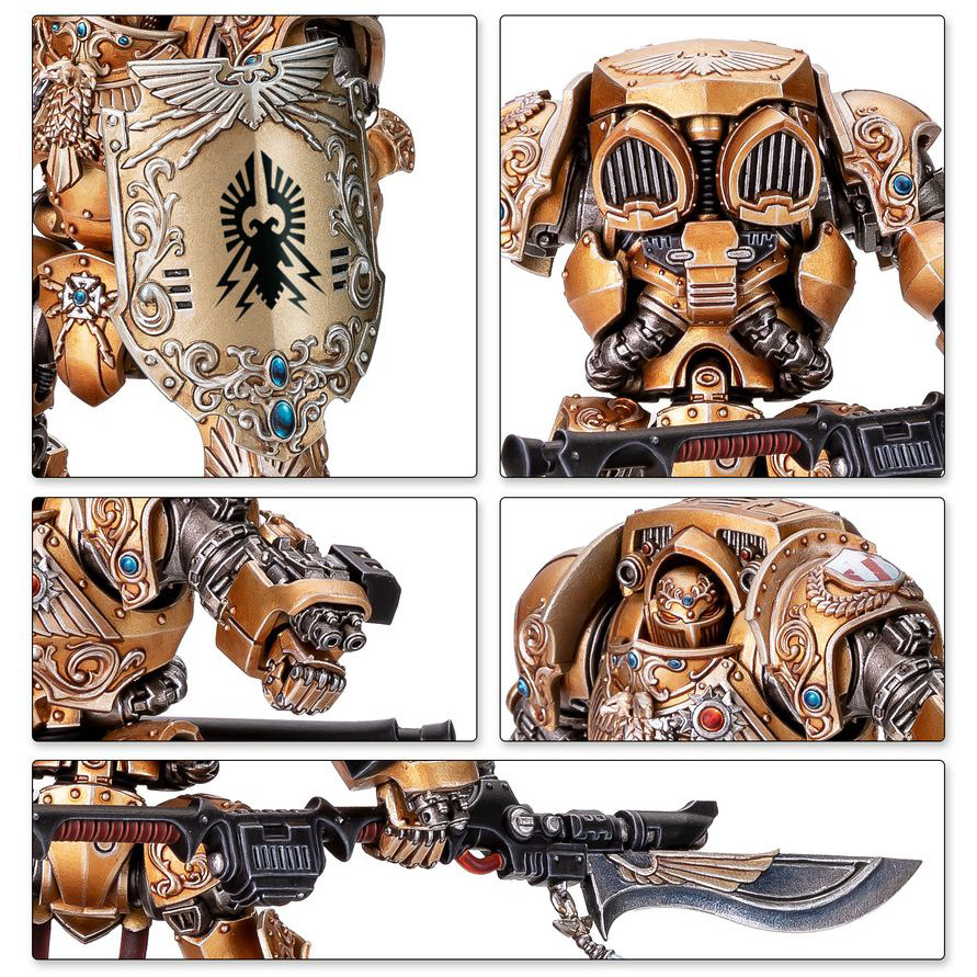 Les Dreadnoughts de la Legio Custodes sont des machines magnifiques et sophistiquées qui combinent une force et une vitesse phénoménales aux talents martiaux inégalés du guerrier qu'elles renferment. Lors des rares cas où un Custodien a subi des blessures impossibles à soigner, mais que son esprit est intact, il est inhumé dans le corps froid et inflexible d'un Dreadnought, car aucun Custodien n'accepterait que son devoir prenne fin avant sa mort.